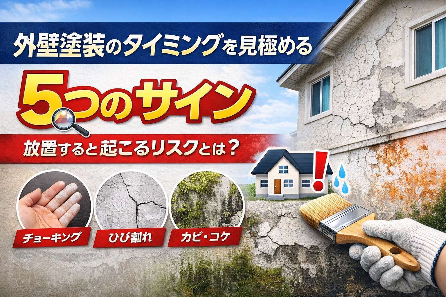 この記事では、画像でも紹介している外壁塗装のタイミングを判断する5つのサインについて詳しく解説します。